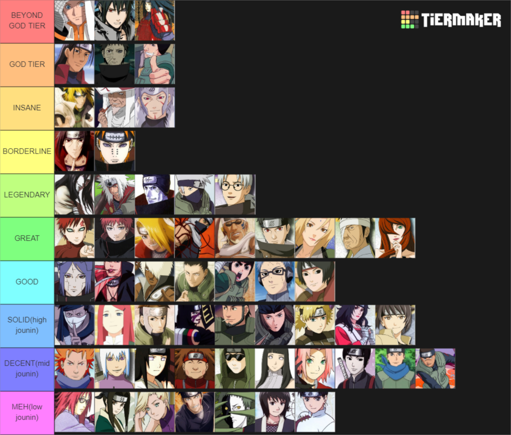 Swagkage and seththeprogrammer who hates the wiki and its memebers are likely planning to review other tier list and profiles mainly naruto dragon ball and bleach which are not revised spreading more hate towards this wiki. A tier list is a list that ranks the characters in the franchise naruto according to their strength which is determined by reviewing their feats and portrayal through the manga. Feel free to use the tier list to check on how good or bad is your chosen character. Tobeis tier list is an unofficial naruto online tier list created by the titular forum moderator tobei. Ultimate naruto character list 150 tier list maker share template on twitter share template on facebook whether its by power favoritism or. God tier this tier belongs to those who have achieved godlike powers.