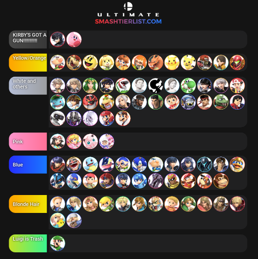 This smash ultimate tier list for patch 80 is based on the characters viability in a player for player setting pvp. Smash ultimate tier list by the numbers while dabuzs tier list was based on his experiences and opinions as a top player redditor funbunsunicrons put together a ranking of the characters that. Mkleos tier list for smash ultimate 70 is here. The ultimate smash tier list. If you are just trying to have fun when you play then pick whatever speaks to you since each has their own unique playstyle and is worth exploring. Tier list your links name your tier select a colour sort alphabetically remove tier.