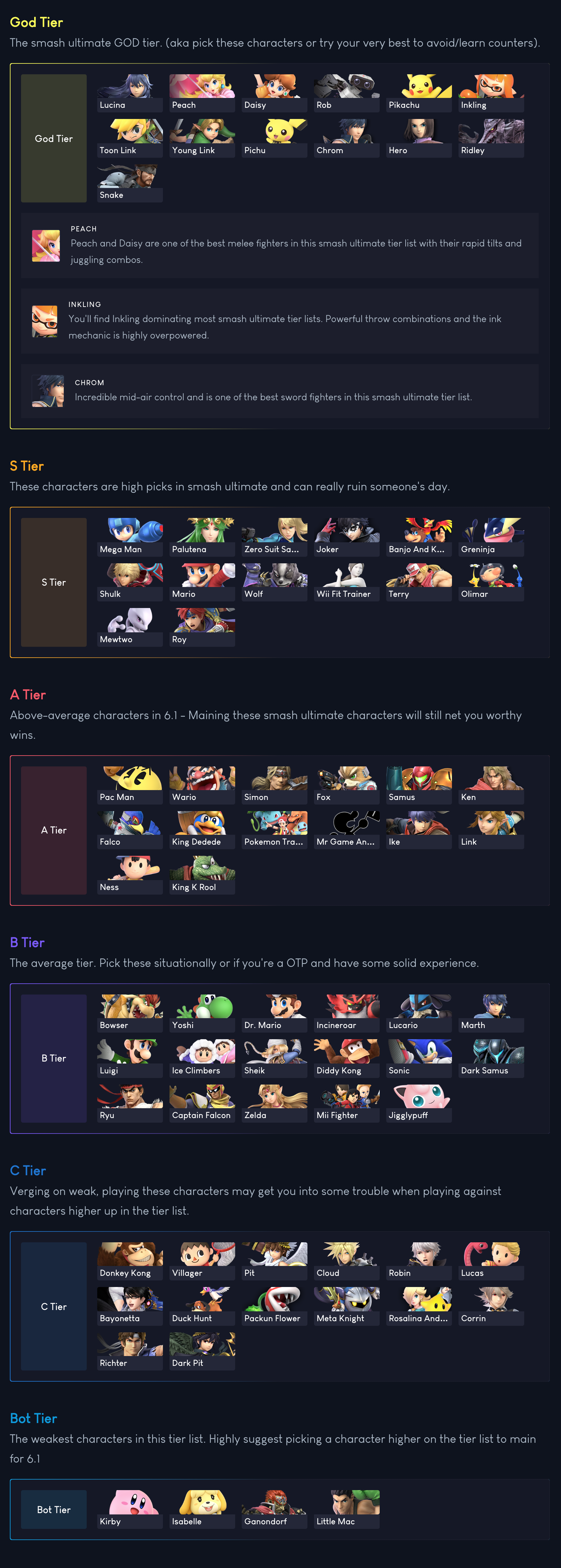The ultimate smash tier list. Will a tier list for ultimate be created from the information from the best buy demo. Welcome to smashboards the worlds largest super smash brothers community. Under normal circumstances this sort of information would come through a smash specific wiki or an enthusiast site like smashboards. Ultimate from nintendo switch and last updated on february 18th 2020.