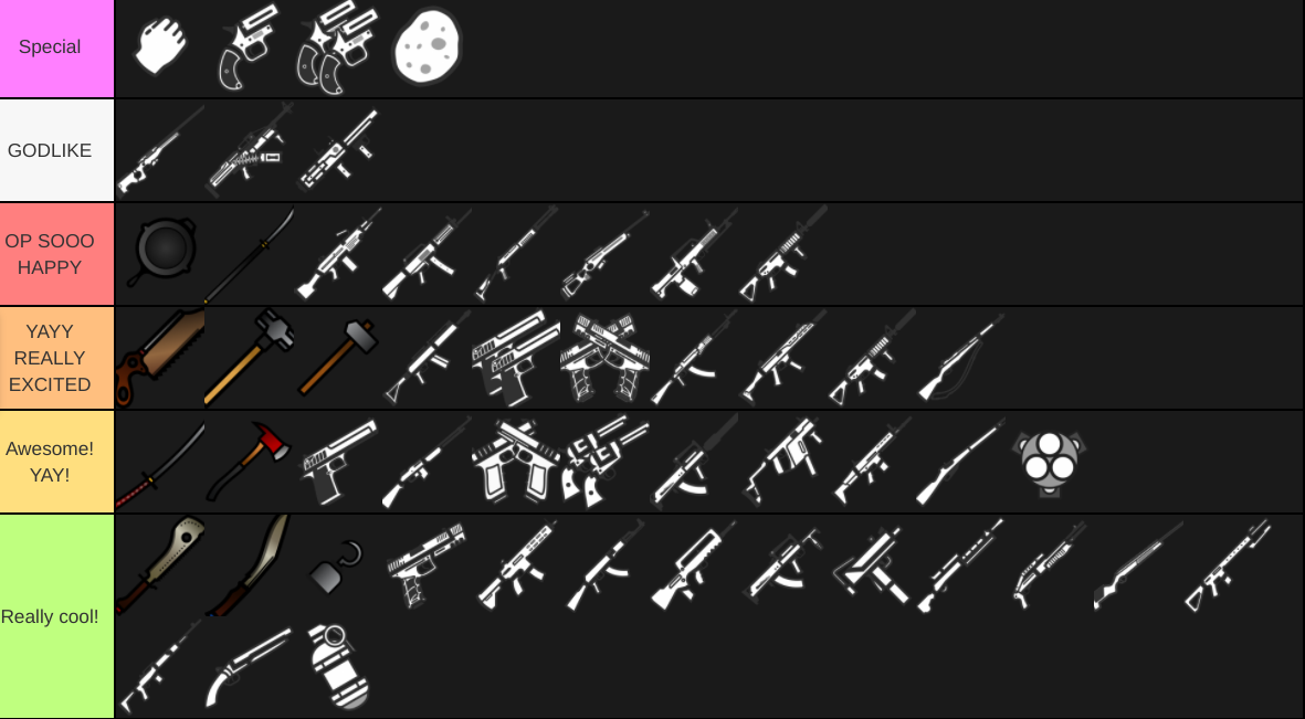 Weapons are an essential feature in survivio that allow a player to inflict damage on and kill another player. I am non longer going to update this list because of my lack of interest with the game in its current state. The biggest survivio guns tier list. Some weapons can only be obtained in certain events and others can only be obtained from specific buildings or crates. The tier list. The m9 m1911 p30l and deagle 50 are semi automatic whilst.