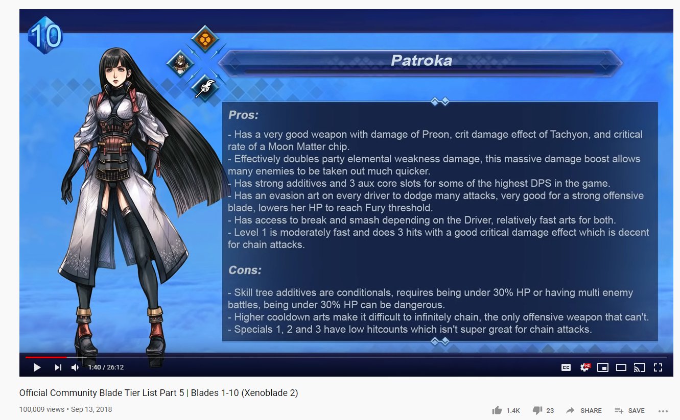 In a solo driver i am able to kill ophion around 2 3 minutes with her which is not that bad given how she only have 2 aux slot vs other top tier blades. Rare blades demi godlike unnamed common blade from the core crystal gramps gives you useful but weak. Xenoblades xenoblade x party members. For xenoblade chronicles 2 on the nintendo switch a gamefaqs message board topic titled my final blade tier list. All other common blades livestock to be farmed for weapon manuals overdrives and boosters. Story blades godlike.